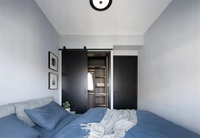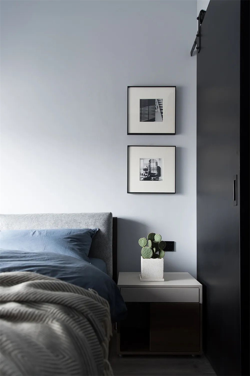 主臥室延續了整體的極簡風格,以淺灰色和白色的搭配為主,消除了多余的裝飾元素。深色的定制柜和藍灰色的床品為臥室注入了寧靜的舒適感。通過精心設計的照明,臥室的空間質感和氛圍得以突顯,使簡潔的設計與窗外的自然景色相得益彰。