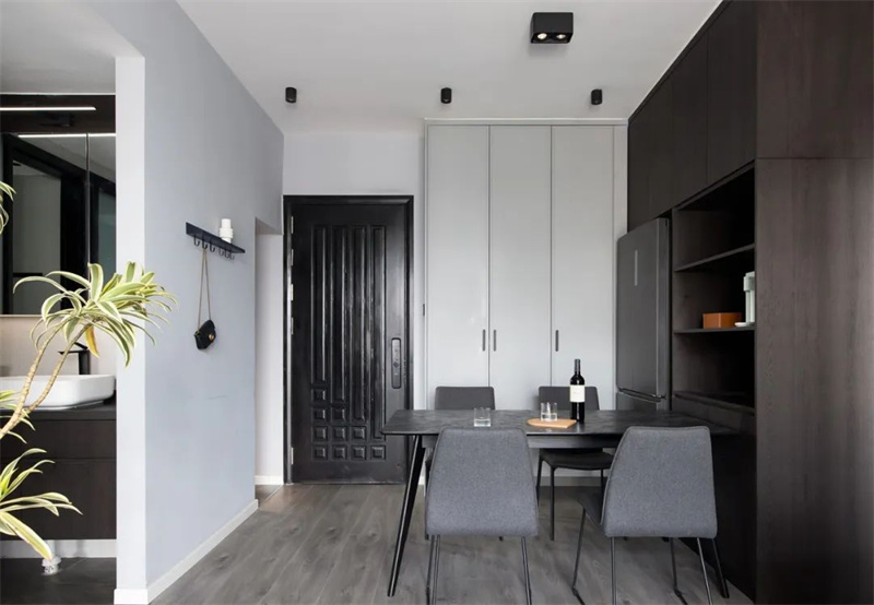 餐廳延續了整體的簡約優雅設計風格,以黑色大理石臺面的餐桌為中心,配以灰色布藝餐椅。旁邊的餐邊柜和嵌入式冰箱完美融合,使整個空間顯得清新、簡約和寬敞舒適。